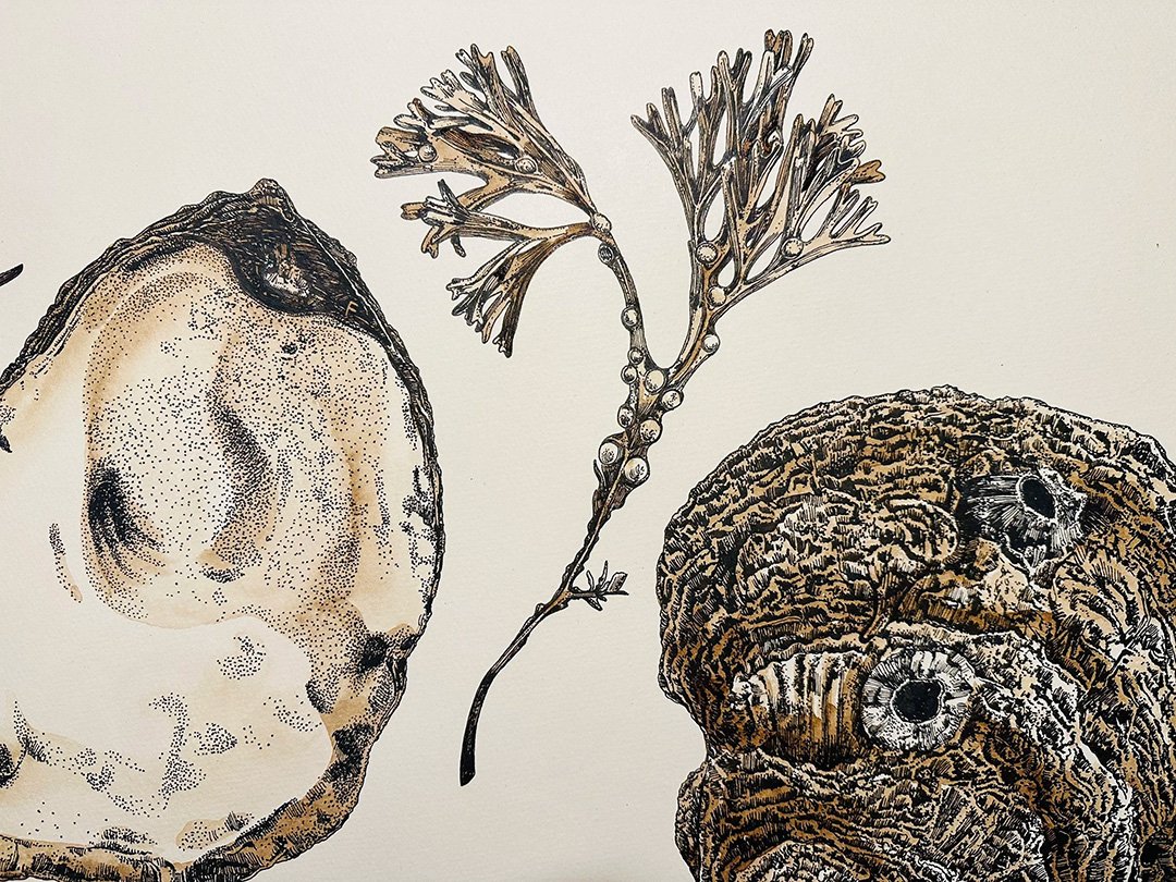 Commissioned by Wetherspoons for the entrance of the Packet Station pub in Falmouth, this piece explores the town’s long-standing oyster-fishing heritage. Research revealed the history of Falmouth Bay Oysters, still traditionally dredged under sail today. Created in ink on handmade rag paper, 100 × 70 cm.